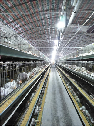 根據飼養規模要配套安裝照明設備,要注意照明線路的安全可靠。以單組雞計算,需燈10盞。燈泡高度離地面2.1—2.4米,燈距3—3.5米,需交叉兩排。燈泡到墻的間距為燈泡間距的一半(即1.5—1.75米)