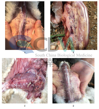 結(jié)果表明,A組吸收無(wú)異常;B組注射部位有較多未吸收疫苗;C組注射部位出現(xiàn)肉芽腫,炎性反應(yīng),干酪樣物;D組無(wú)異常。