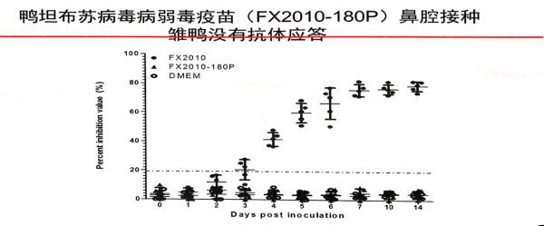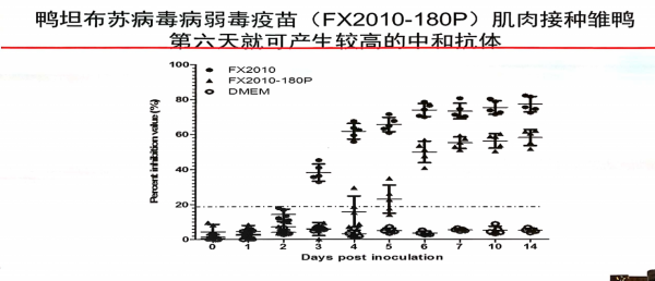 疫苗無法通過黏膜免疫產生有效的免疫應答,只能通過肌肉注射的方式,免疫后4-6天能夠產生中和抗體,但應該考慮過早免疫,雛鴨母源抗體的影響,同時也應該考慮免疫后抗體持續(xù)期能否保護至出欄,所以應該進行科學的抗體監(jiān)測來制定合理的免疫方案。