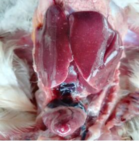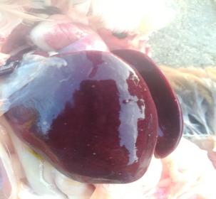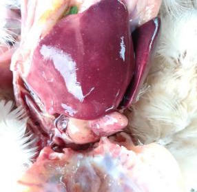 本場(chǎng)爆發(fā)的雞霍亂病例中多為急性病例,雞群并未見明顯的臨床癥狀,多數(shù)雞突然死亡。少部分雞精神倦怠、離群呆立,少見甩頭癥狀。病雞排黃綠色稀糞,呼吸加快。體重較大的雞死亡率較高,剖檢可見鼻腔有泡沫狀粘液,雞冠蒼白水腫;氣管有卡他性滲。心臟脂肪和外膜出血,肝臟有明顯的白色壞死點(diǎn);十二指腸粘膜紅腫。肝臟病變見下圖: